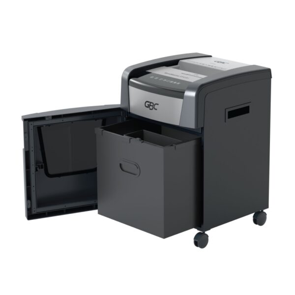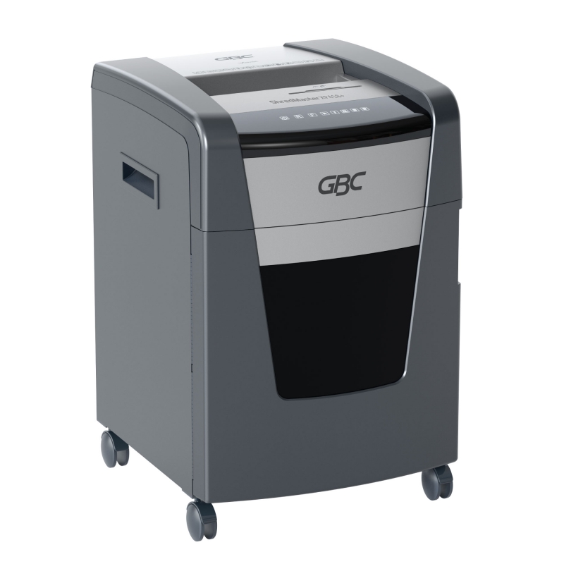 Momentum Extra jam free paper shredders are ideal for destroying confidential documents in the office. Active sensing technology measures the number of sheets being fed in real-time to stop paper jams and misfeeds; indicated by a red LED on the control panel. This paper shredder will not operate until the number of sheets is reduced below or at the maximum sheet capacity. This cross cut shredder is designed for moderate to heavy use with its high sheet capacity, large bin size and continuous run time. There’s no need to remove staples and paper clips first; this GBC shredder also safely shreds CD’s, DVD’s and credit cards through a separate feed slot.