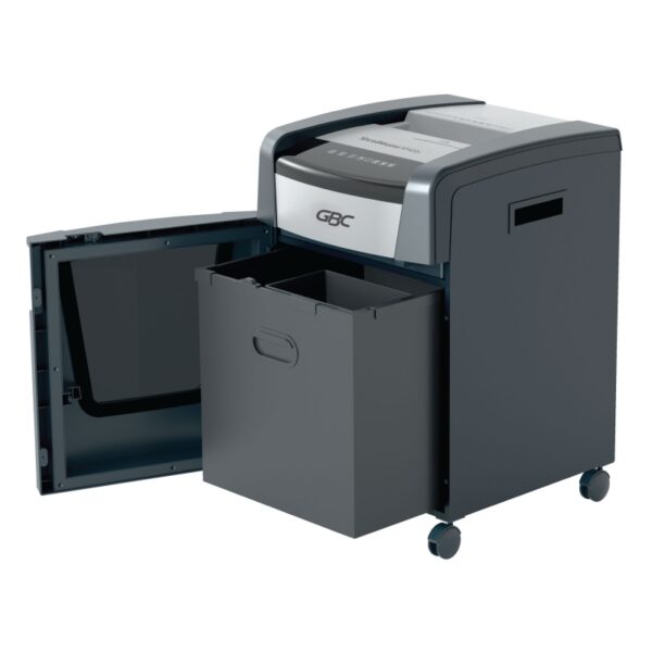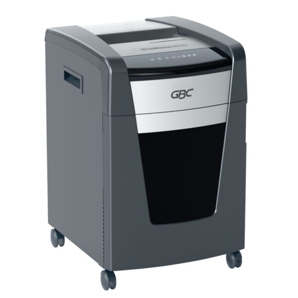 Momentum Extra jam free paper shredders are ideal for destroying confidential documents in the office. Active sensing technology measures the number of sheets being fed in real-time to stop paper jams and misfeeds; indicated by a red LED on the control panel. This paper shredder will not operate until the number of sheets is reduced below or at the maximum sheet capacity. This cross cut shredder is designed for moderate to heavy use with its high sheet capacity, large bin size and continuous run time. There’s no need to remove staples and paper clips first; this GBC shredder also safely shreds CD’s, DVD’s and credit cards through a separate feed slot.