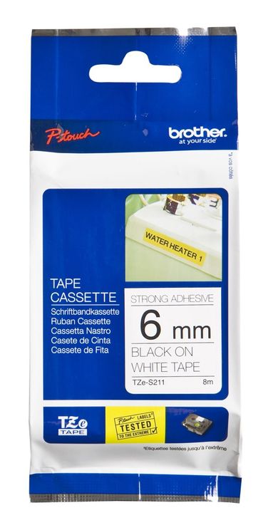 The 6mm x 8m Brother TZe-S211 genuine strong adhesive tape is one of the toughest labelling materials that you can use. With extra strength adhesive, the black on white Brother TZe-S211 tape is ideal for industrial applications. The Brother TZeS211 laminated P-Touch label can be used on surfaces that are exposed to harsh environments, rough and uneven surfaces, plastic surfaces, or even slippery painted metals. You can expect clear and readable black text on the white Brother TZeS211 strong labelling tape.
